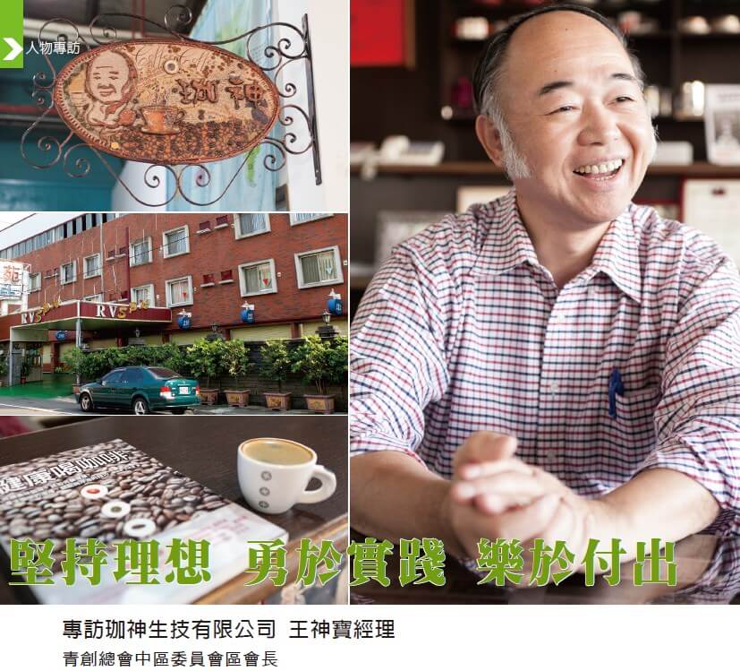王神寶,珈神生技有限公司的經理,從農家子弟起步,以銀樓開業初嘗創業滋味,然遭遇挫折後,重拾鬥志,轉向旅館經營,並融入咖啡文化,開創新藍海。他不僅在逆境中重生,還積極進行咖啡科學研究,致力於養生咖啡的開發。他擁有不屈不撓的精神,以正面思考和感恩心態迎接挑戰,並希冀透過咖啡帶來社會正向影響,成為業界的咖啡達人和創業典範。
